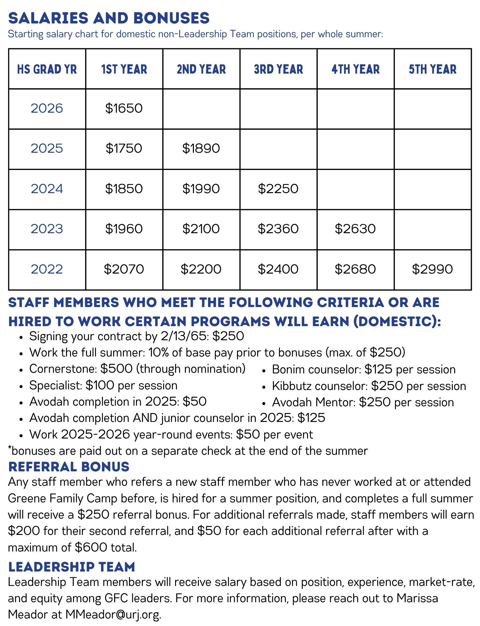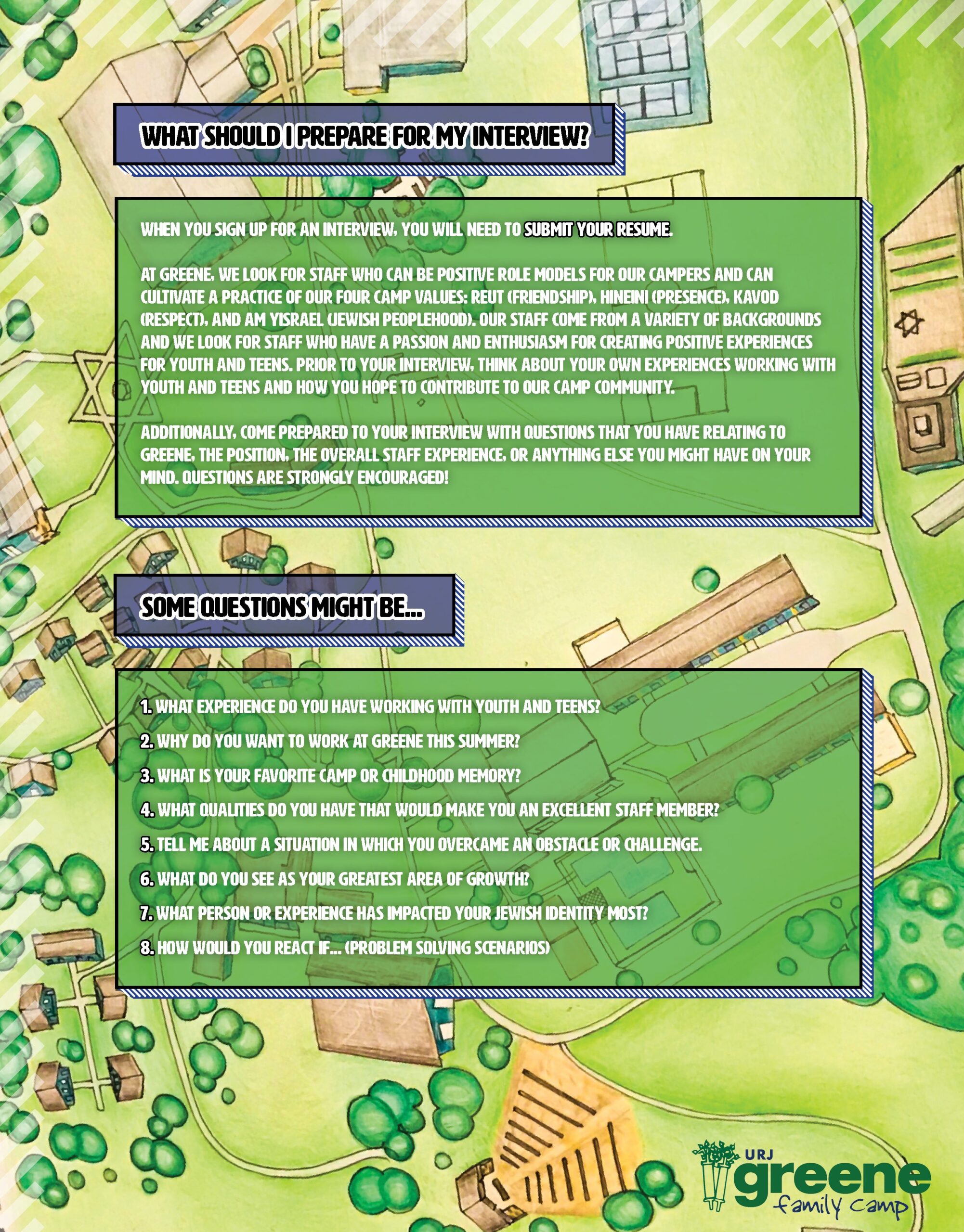 The standard camp season is 9 weeks; this includes a full week of staff orientation which is considered a vital component of Greene’s summer. Arrival dates to camp are dependent on your position and are included in your staff contract. Discussion of the expected dates of attendance will occur during your interview. Our leadership team and specialists requiring additional training, such as waterfront or challenge course, are expected to arrive in late May. Counselors and specialists will be expected to arrive in early June. Our summer concludes in early August. We are able to accommodate only a limited number of staff who are unable to stay the entire time.